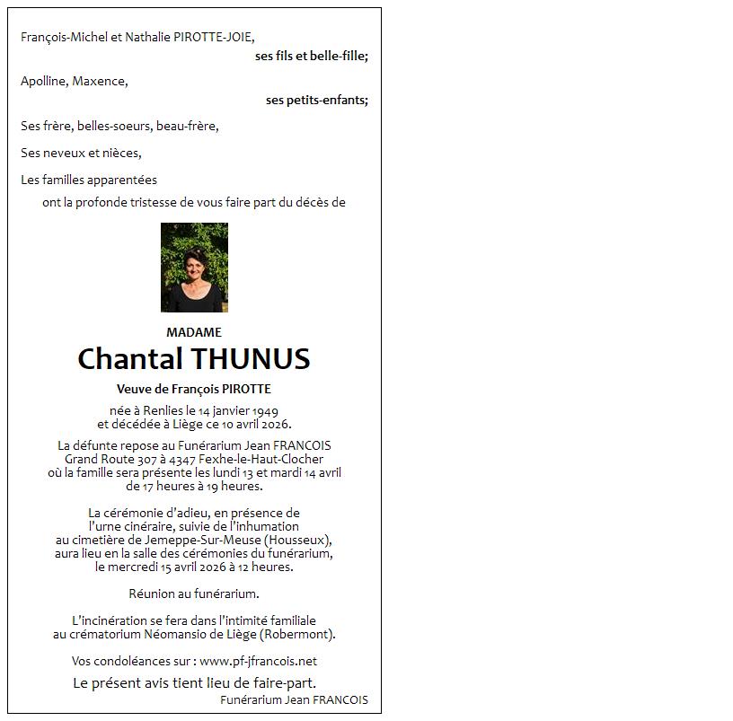 Décédée à Liège (4000) le vendredi 10 avril 2026 à l'âge de 77 ans